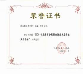 上海市會展行業防疫抗疫貢獻突出企業榮譽證書
